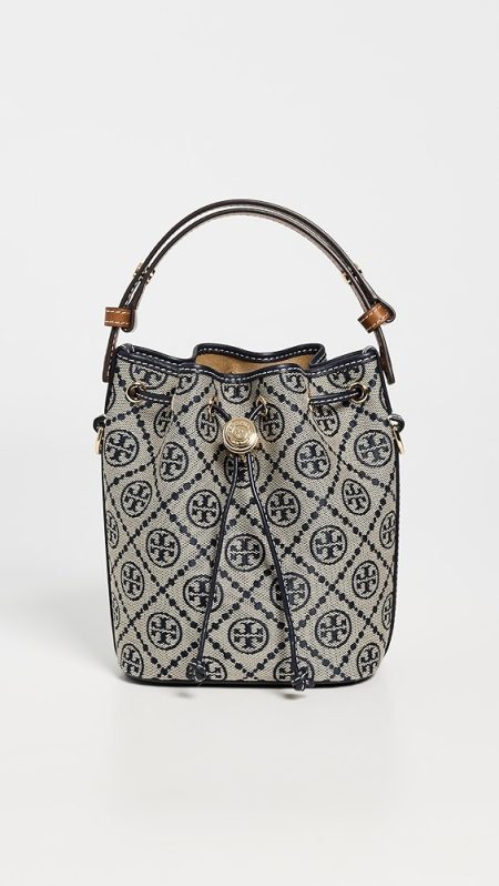 Jacquard Structured silhouette Gold-tone hardware Monogram pattern Drawstring top Optional, adjustable strap Lining: Suede Weight: 9oz / 0.26kg Imported, Vietnam Style #TORYB51029