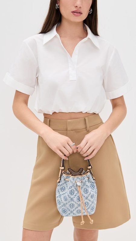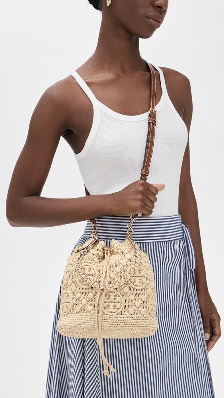 A low-key option for workdays and weekends alike, this scaled-down Tory Burch bucket bag is crafted from neutrally colored leather and embellished with a subtle version of the label's logo.